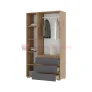 Трёхстворчатый шкаф Хелен ШК 06 с двумя распашными створками неполной высоты, открывающиеся захватом снизу, укомплектованы хромированной штангой для одежды. В нижней части шкафа — три ящика полного выдвижения. Боковая секция модуля в виде глухого пенала открывается с помощью отталкивателя и оснащена полками.