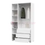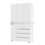 Трёхстворчатый шкаф Хелен ШК 06 с двумя распашными створками неполной высоты, открывающиеся захватом снизу, укомплектованы хромированной штангой для одежды. В нижней части шкафа — три ящика полного выдвижения. Боковая секция модуля в виде глухого пенала открывается с помощью отталкивателя и оснащена полками.