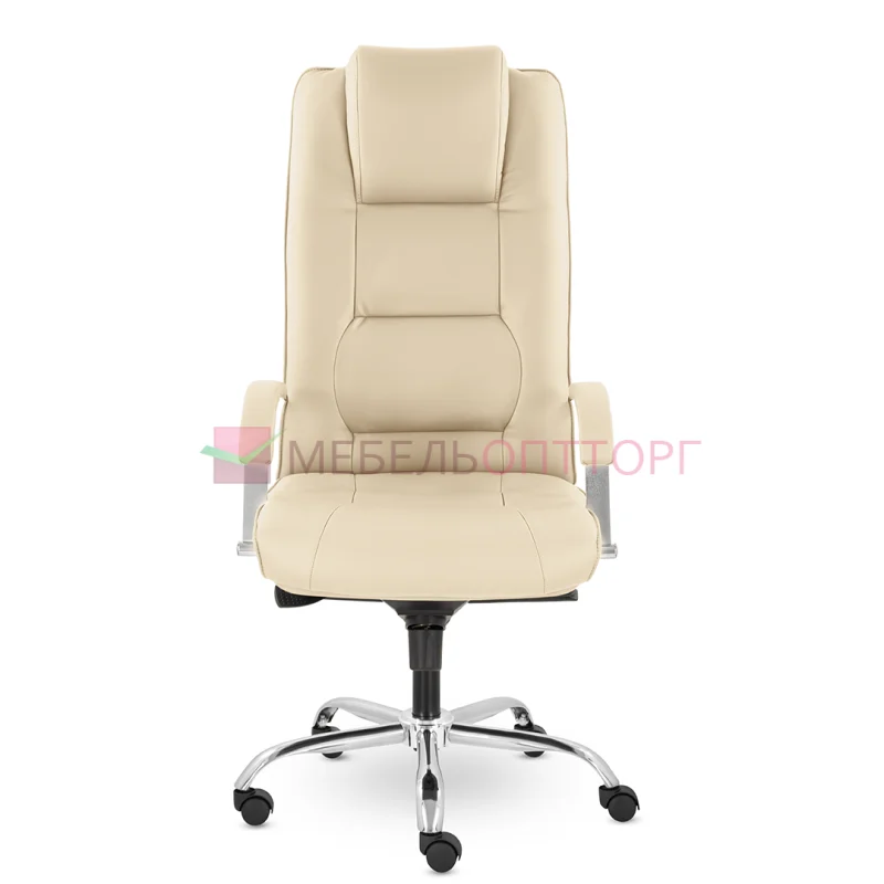 Грациозное кресло руководителя с ярко выраженным мягким подголовником. Спинка и сидение имеют горизонтальные прострочки, делящие их на квадраты. Хромированные подлокотники с мягкими накладками. Кресло стоит на хромированной крестовине, максимальная нагрузка которой 120 кг.