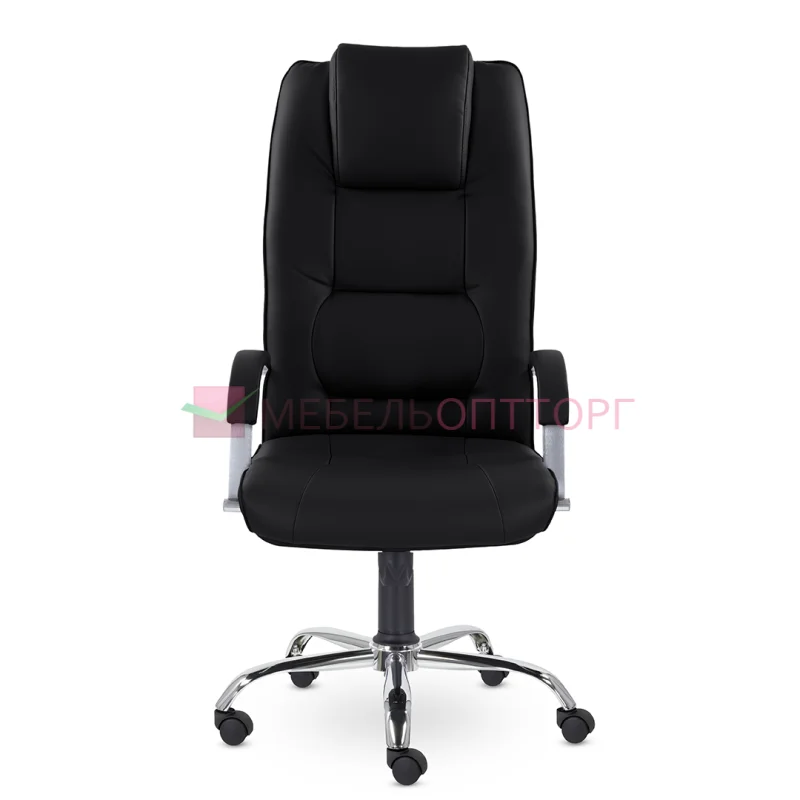 Грациозное кресло руководителя с ярко выраженным мягким подголовником. Спинка и сиденье имеют горизонтальные прострочки, делящие их на квадраты. Хромированные подлокотники с мягкими накладками. Кресло стоит на хромированной крестовине, максимальная нагрузка 150 кг.