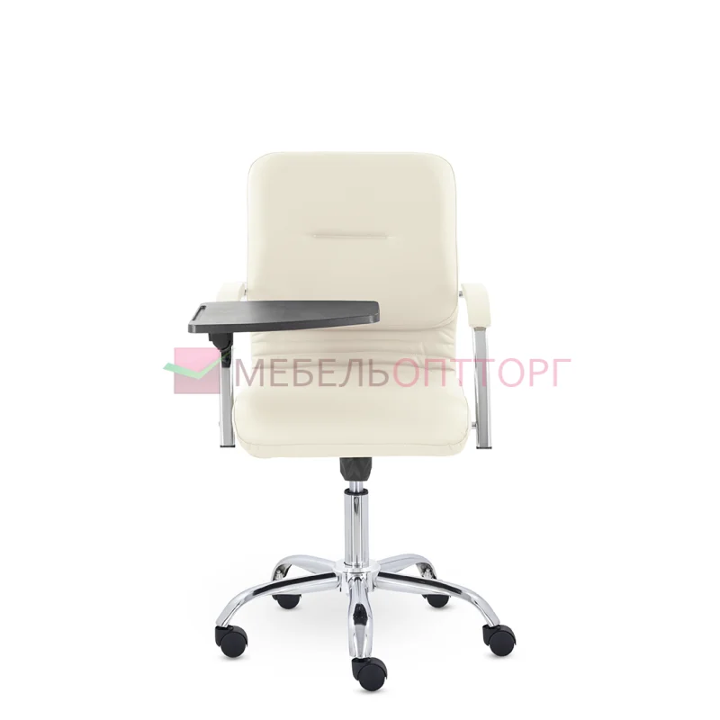 Улучшенная комплектация кресла включает горизонтальные прострочки, соединяющие спинку и сиденье, что придает креслу современный нео-классический стиль. Удобные накладки обеспечивают комфортную поддержку рук и способствуют их расслаблению. К креслу прилагается столик, выполненный из пластика. Модель отлично подойдет для конференц-залов, переговорных, актовых залов.