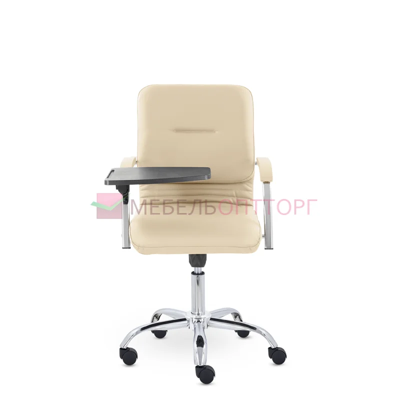 Улучшенная комплектация кресла включает горизонтальные прострочки, соединяющие спинку и сиденье, что придает креслу современный нео-классический стиль. Удобные накладки обеспечивают комфортную поддержку рук и способствуют их расслаблению. К креслу прилагается столик, выполненный из пластика. Модель отлично подойдет для конференц-залов, переговорных, актовых залов.