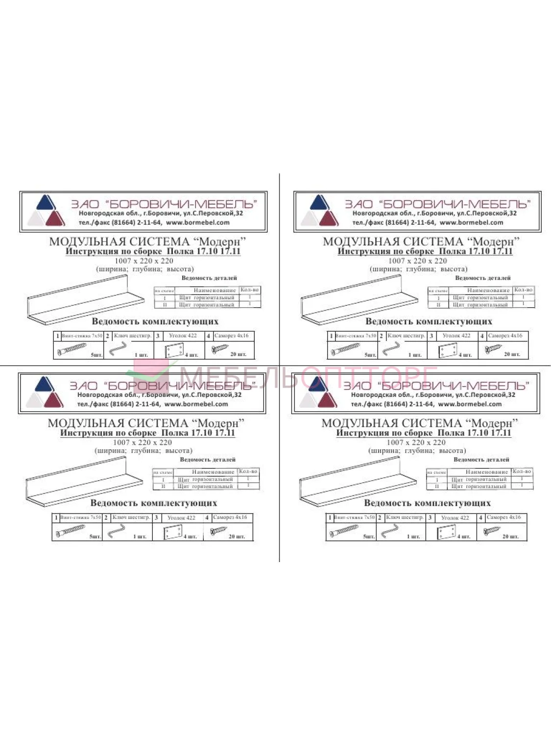 17.11 Полка 1202х220х236 - сборка под ключ! Хотите купить мебель «17.11 Полка 1202х220х236» сейчас, но у вас нет такой суммы? Приобретайте его в кредит или рассрочку! Читайте честные отзывы про мебель «17.11 Полка 1202х220х236» фабрики Боровичи-Мебель.