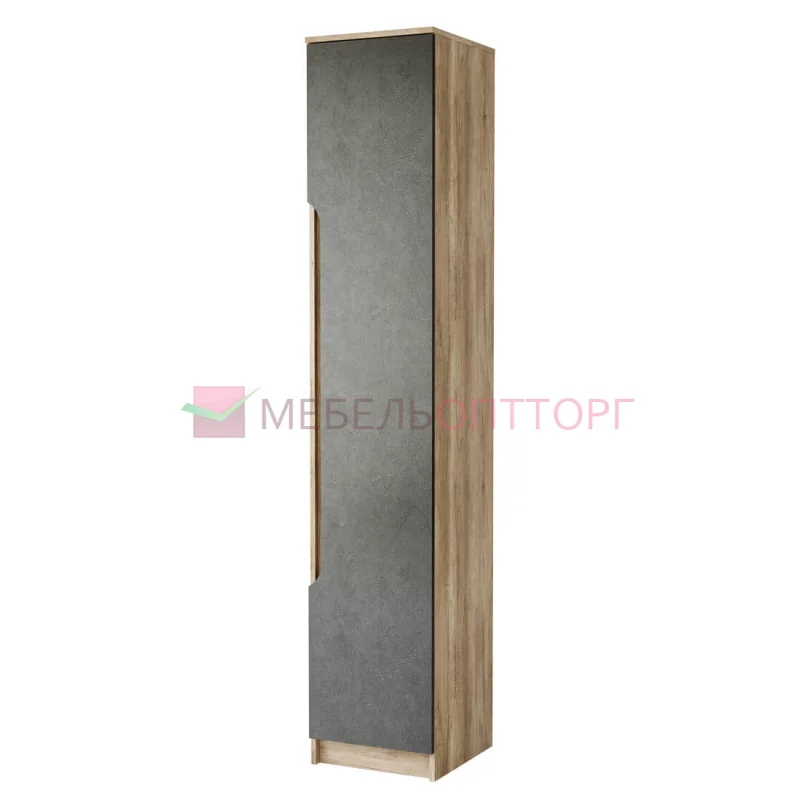 Модель изготовлена из ЛДСП в цвете дуб каньон, а фасад распашной дверцы выполнен в темном цвете, такое сочетание придает пеналу стиля и делает его очень современным, внутренняя комплектация состоит из полок, на которых можно расположить самые разнообразные вещи или предметы одежды.