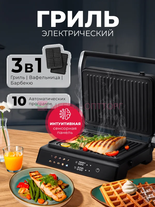 Гриль быстро и равномерно нагревается, обеспечивает нужную температуру приготовления для превосходной корочки снаружи и сочности внутри. Модель имеет 10 автоматических программ, в том числе для приготовления вафель. Сменные панели для них входят в комплект.