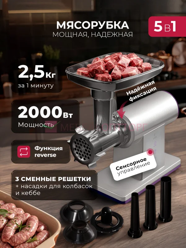 В комплектацию входят три стальных диска для помола - мелкий, средний и крупный. Это даёт возможность получить фарш нужной консистенции для любых кулинарных задач: от мягкого и однородного до более структурного. Также в комплект входят насадки для приготовления домашних колбас и традиционных восточных блюд - кеббе. Все элементы выполнены из прочного металла, не подверженного коррозии и легко очищаются после использования.