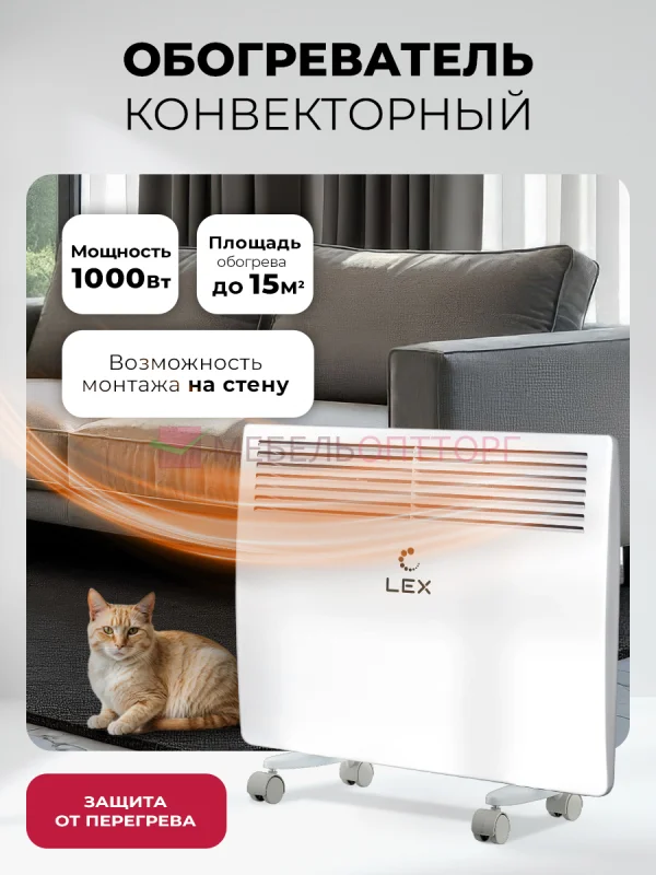 <p>Конвекторный обогреватель LEX LXCV 1000 мощностью 1000 Вт эффективно и практически бесшумно обогревает помещение при низком энергопотреблении. Это идеальное решение для тех, кто ищет экономичный и компактный обогреватель для дома или офиса.Конвектор оборудован монолитным нагревательным элементом, что позволяет быстро и эффективно обогреть помещение.Благодаря наличию термостата, вы можете регулировать температуру, создавая комфортные климатические условия в помещении.Модель оснащена защитой от перегрева, что гарантирует безопасную эксплуатацию устройства в любых условиях.Компактные размеры обогревателя (400х460х80 мм) и вес 3,2 кг позволяют легко перемещать его в пределах комнаты. Вы можете выбрать подходящий вам тип установки - в комплекте идут крепления для настенного монтажа и опоры с колесами.Механическое управление делает использование прибора простым и интуитивно понятным.</p><p>Конвекторный обогреватель LEX LXCV 1000— идеальное решение для тех, кто ценит комфорт и функциональность.</p><p>Комплектация:обогреватель конвекторныйопора с колесамикомплект креплений для настенного монтажа</p>