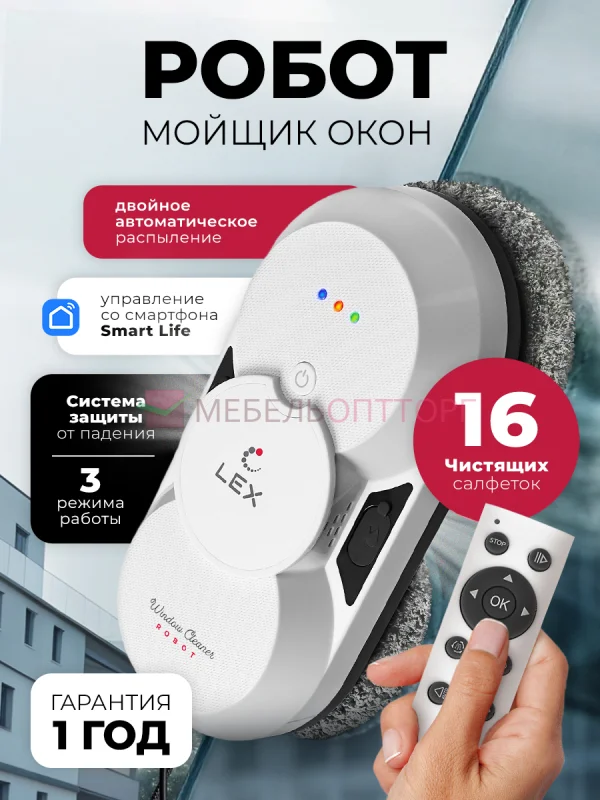 <p>Робот мойщик окон LEX LXVCW7091 идеально подходит для быстрого и эффективного мытья окон и других гладких поверхностей - стекол, зеркал, кафеля. Модель автоматически определяет границы рабочей поверхности - она распознает оконную раму и другие препятствия и корректирует траекторию движения.</p><p>Скорость очистки LEX LXVCW7091 - 0,5м²/мин, что позволяет быстро очищать большие площади. Модель оборудована функцией автоматического распыления и резервуаром для жидкости 30 мл. Используйте обычную воду или специальное чистящее средство.</p><p>Вы можете выбрать один из трех режимов работы (вдоль рам, по спирали, авто режим). Автоматическая система расчета траектории движения выберет максимально подходящий маршрут и сэкономит ваше время и усилия. Управление роботом мойщиком возможно несколькими способами - через приложение в смартфоне, пультом д/у, кнопкой на корпусе робота.</p><p>Робот-мойщик оснащен надежной системой безопасности. Мощный вакуумный насос надежно фиксирует робот на поверхности. Резервный аккумулятор на 20 минут работы и длинный страховочный трос (5м) защитит робот от падения в экстренных ситуациях отключения электричества. Просто зафиксируйте страховочный трос на неподвижном предмете перед началом эксплуатации.</p><p>Низкий уровень шума в 65 дБ делает устройство тихим, не мешая повседневным делам.</p><p>Инверторный BLDC двигатель обеспечивает долговечность и высокую производительность устройства. Компактные размеры (70x290x144 мм) и вес 2,1 кг делают робот-мойщик окон удобным в хранении и транспортировке.</p><p>Покупка робота для мытья окон станет отличной инвестицией в ваш комфорт и порядок.</p><p>Комплектация:Робот мойщикЧистящие салфетки 16 штСъемные кольца 4 штСтраховочный тросПульт дистанционного управленияБатарейки АААх2 штСетевой адаптерСетевой шнурУдлинитель сетевого шнураГубчатая щетка Флакон для воды/моющего средства с разбрызгивателем</p>