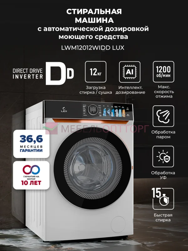 Стиральная машина с инвертором и паром LEX LWM12012WIDD Lux / Отдельностоящий