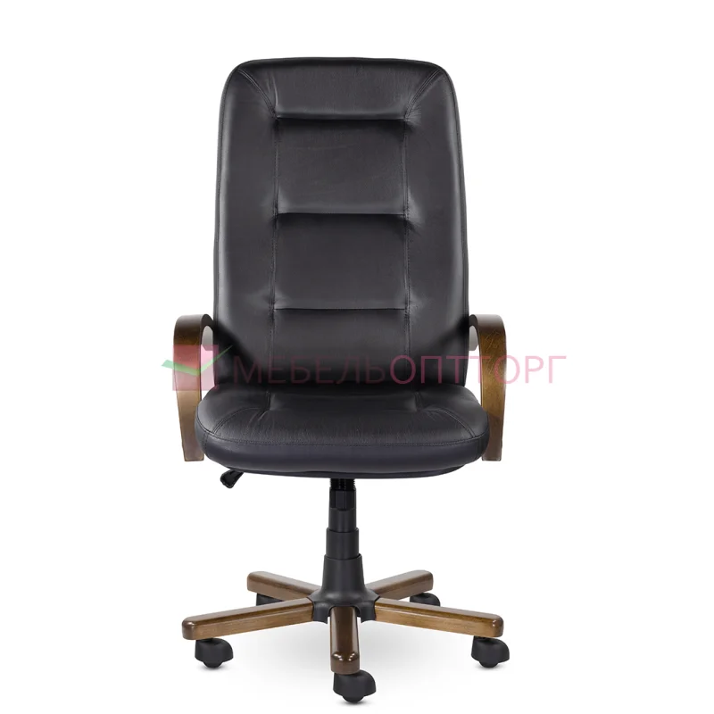Стильное кресло руководителя с широкой спинкой, которое горизонтально разделено стяжками. Деревянные элементы добавляют изящности. Максимальная нагрузка 100 кг.
