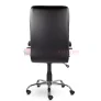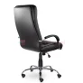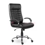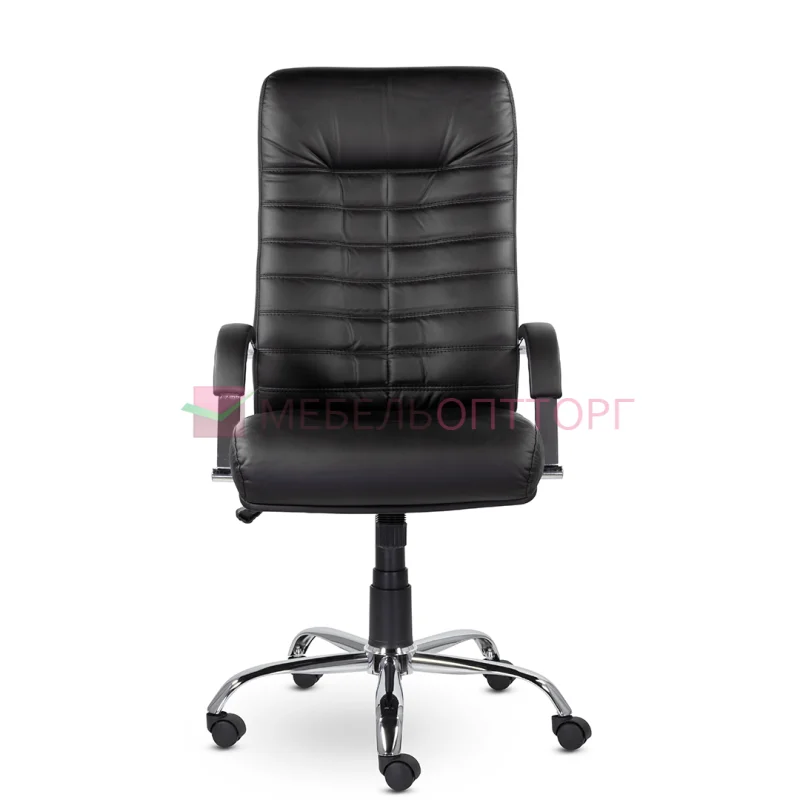 Массивное кресло руководителя с горизонтальными прострочками по ширине всей спинки и углублением. Хромированные подлокотники с мягкими накладками, возможность синхронно отклонять спинку и фиксировать сидение в рабочем положении. Максимальная нагрузка - 150 кг