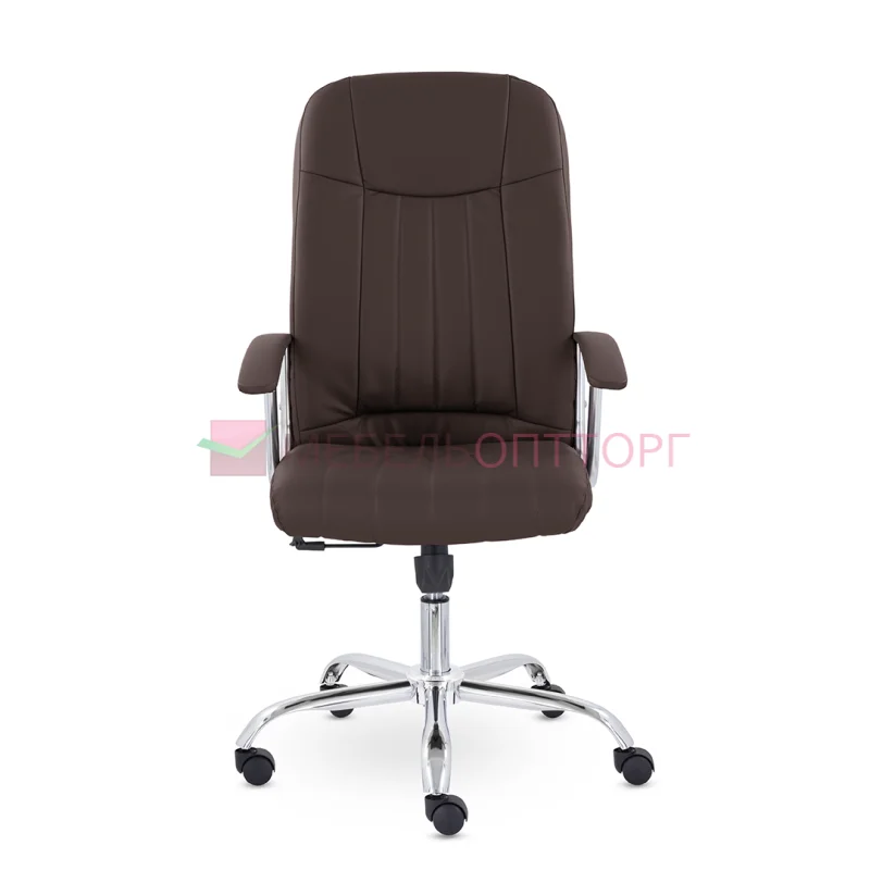 Кресло руководителя с мягкими увеличенными подушками. Широкая эргономичная спинка имеет две горизонтальные прострочки, которые отделяют подголовник от основной части спинки. Благодаря глубокому сиденью, в кресле будет удобно человеку среднего и высокого роста. Длинные хромированные подлокотники способствуют комфортной посадке в кресле. Максимальная нагрузка до 180 кг.